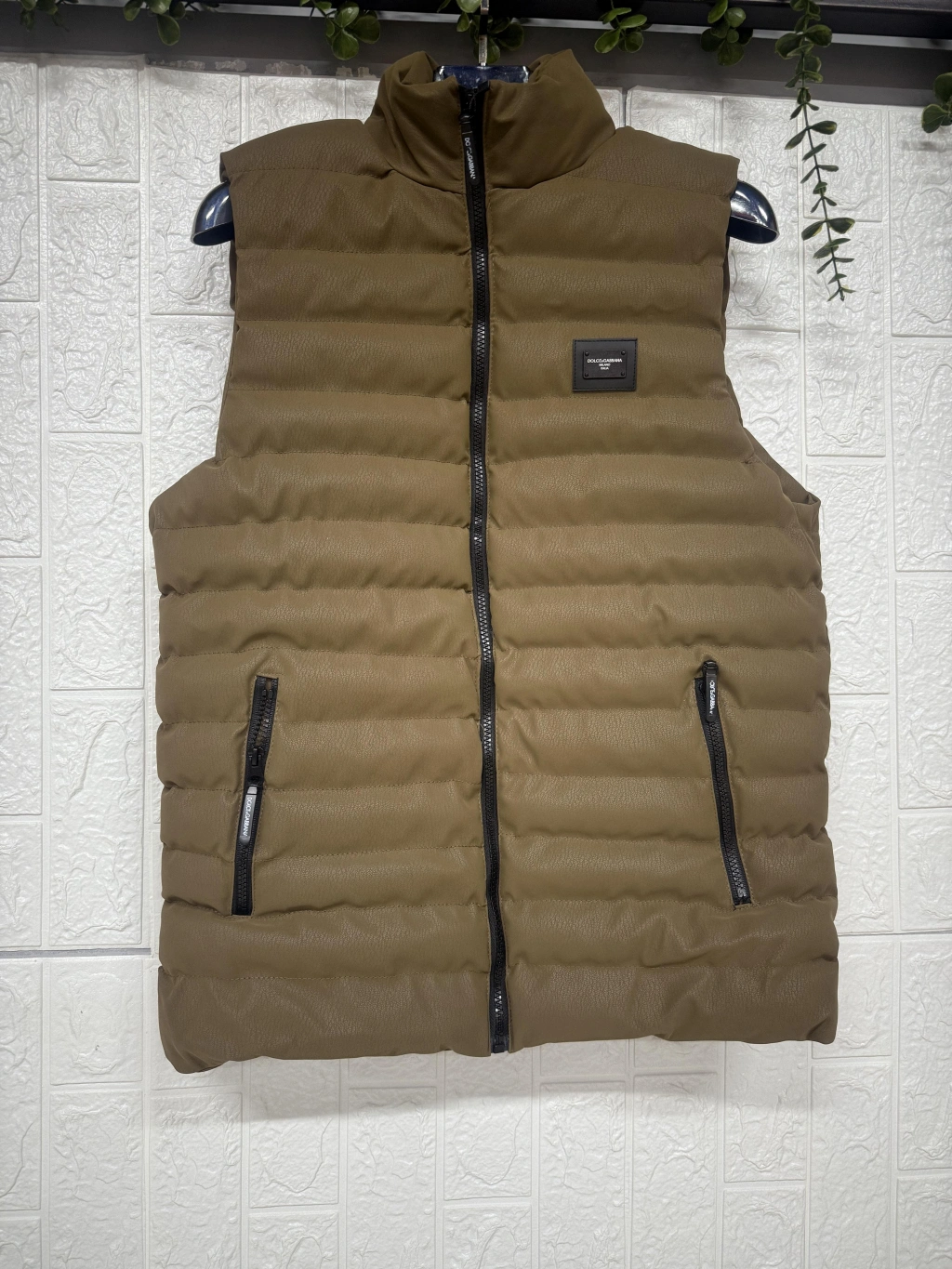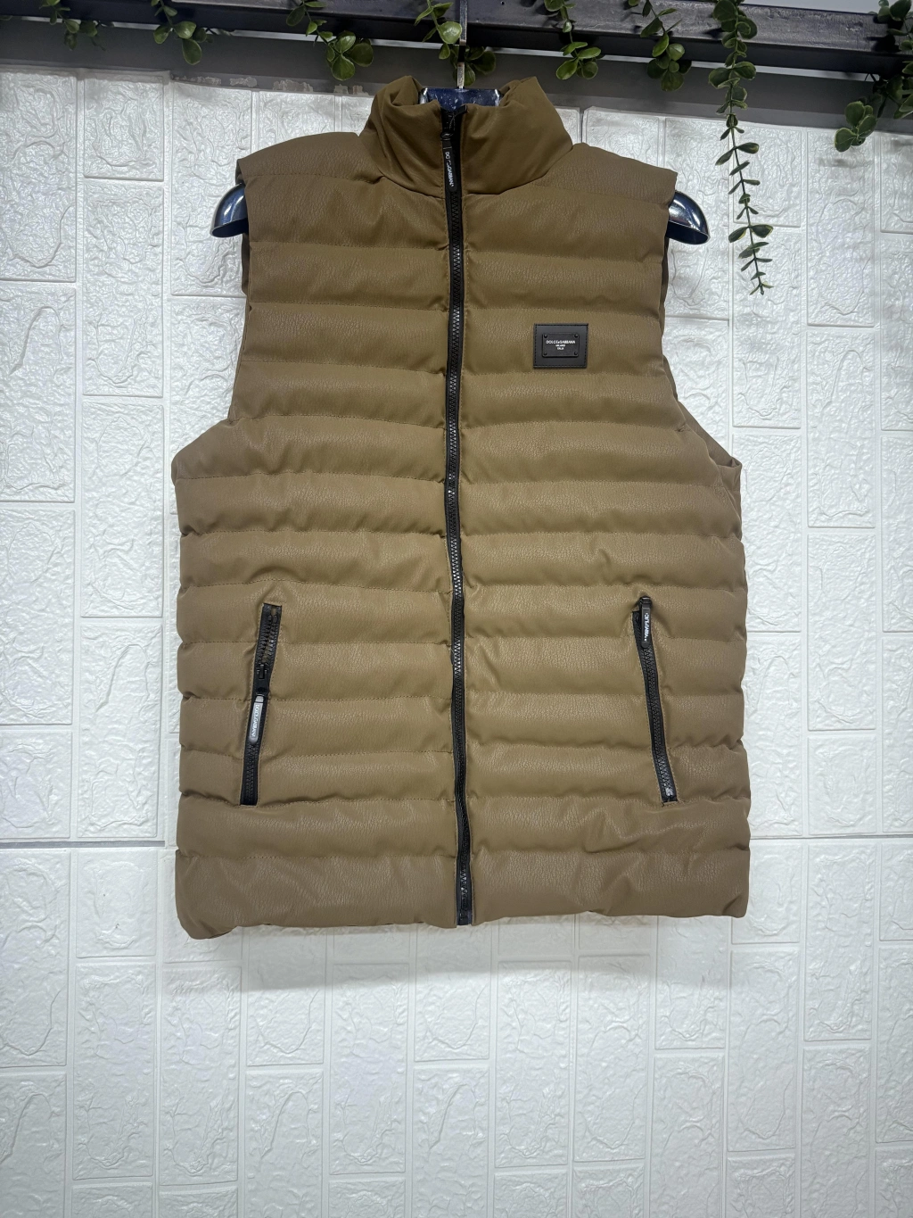 Balıkçı Yaka Fermuarlı Şişme Desen ve Üstü Deri Kolsuz Cepli Yelek